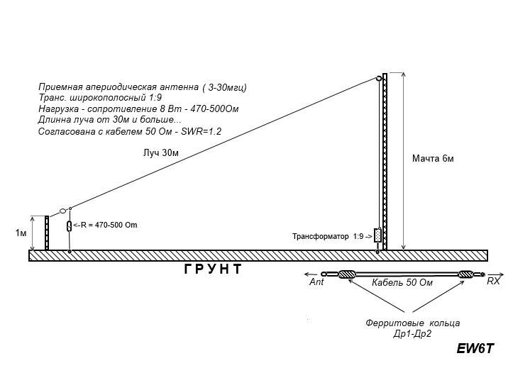 Мной был изготовлен луч, длиной 30м, растянутый вдоль самого длинной стороны моего участка. С одной стороны луча, имеется безиндуктивное сопротивлоение 500 Ом, выполененое из 4-х резисторов по 2Ком мощностью 2 Вт в параллель. Кабель к антенне подключается через согласующий широкополосный трансформатор 1:9, что дало хорошее согласование с кабелем по всему диапазону от 3 до 30мгц. Луч антенны расположен под наклоном, где со стороны нагрузки (500ом), подходит близко к земле, а с противоположной стороны, установил деревянную мачту с роликами для изменения высоты антенны. Мачта нужна для того, что бы менять усиление самой антенны. Близко расположенная к земле антенна практически не принимает никакого шума. Прием идет очень комфортный, чистый, но вследствии очень низкого усиления она дает слышать сигналы станций, только имеющих приличный уровень на передачу. В ходе эксперемента с высотой, я разместил антенну таким образом ( См. рисунок), что бы шумы на входе трансивера, едва едва, отклоняли стрелку С-метра на 1 балл.