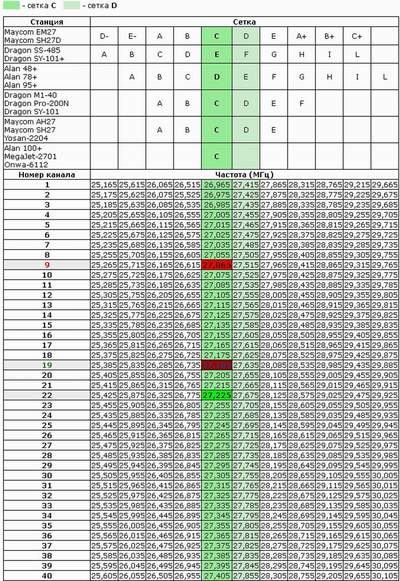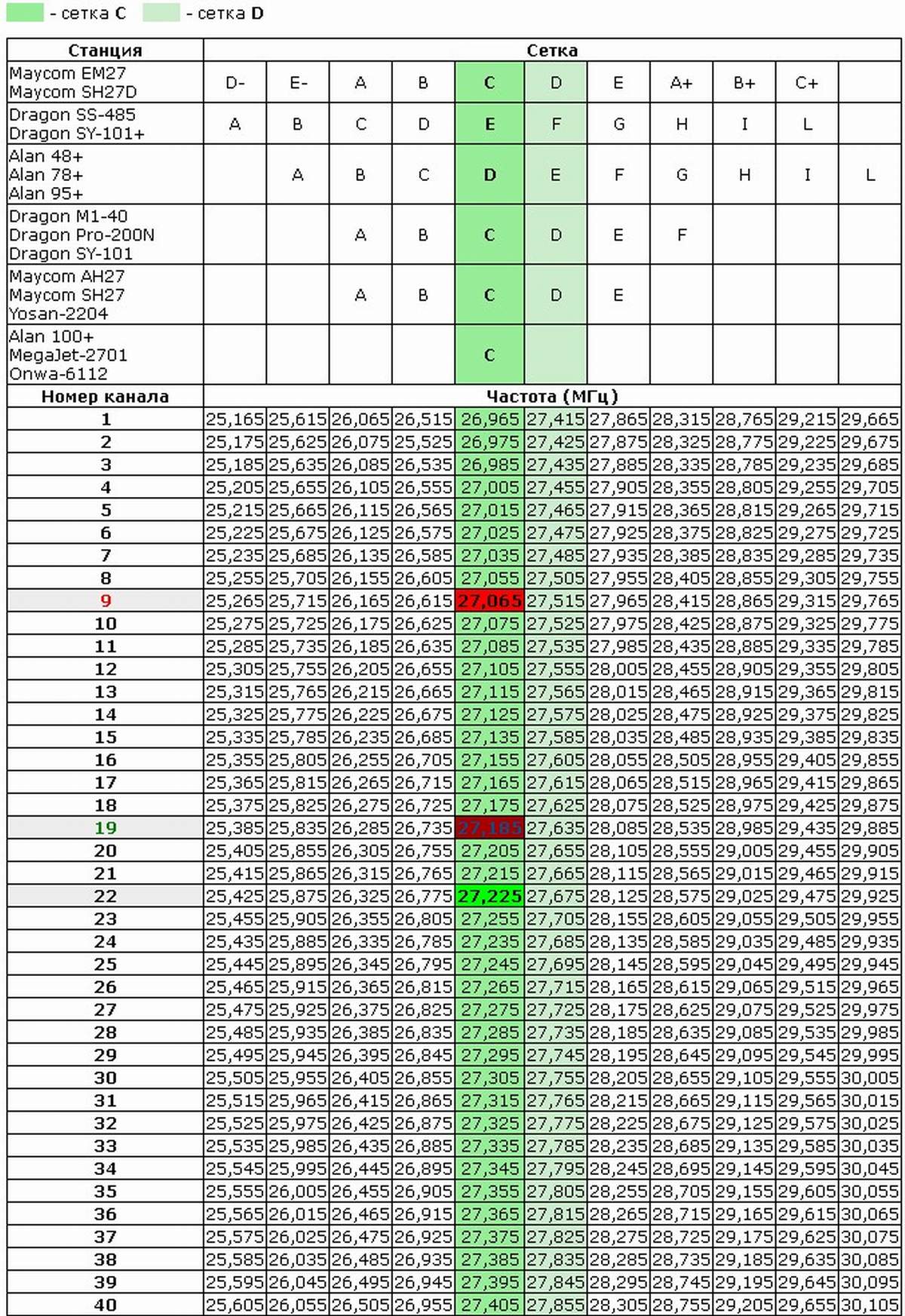 Ниже приведена таблица соответствия частот к каналам и сеткам для самых распространённых радиостанций Си-Би диапазона в Европейском стандарте. Зеленым цветом выделены частоты, разрешенные на территории Казахстана. Использование остальных частот - категорически запрещено.