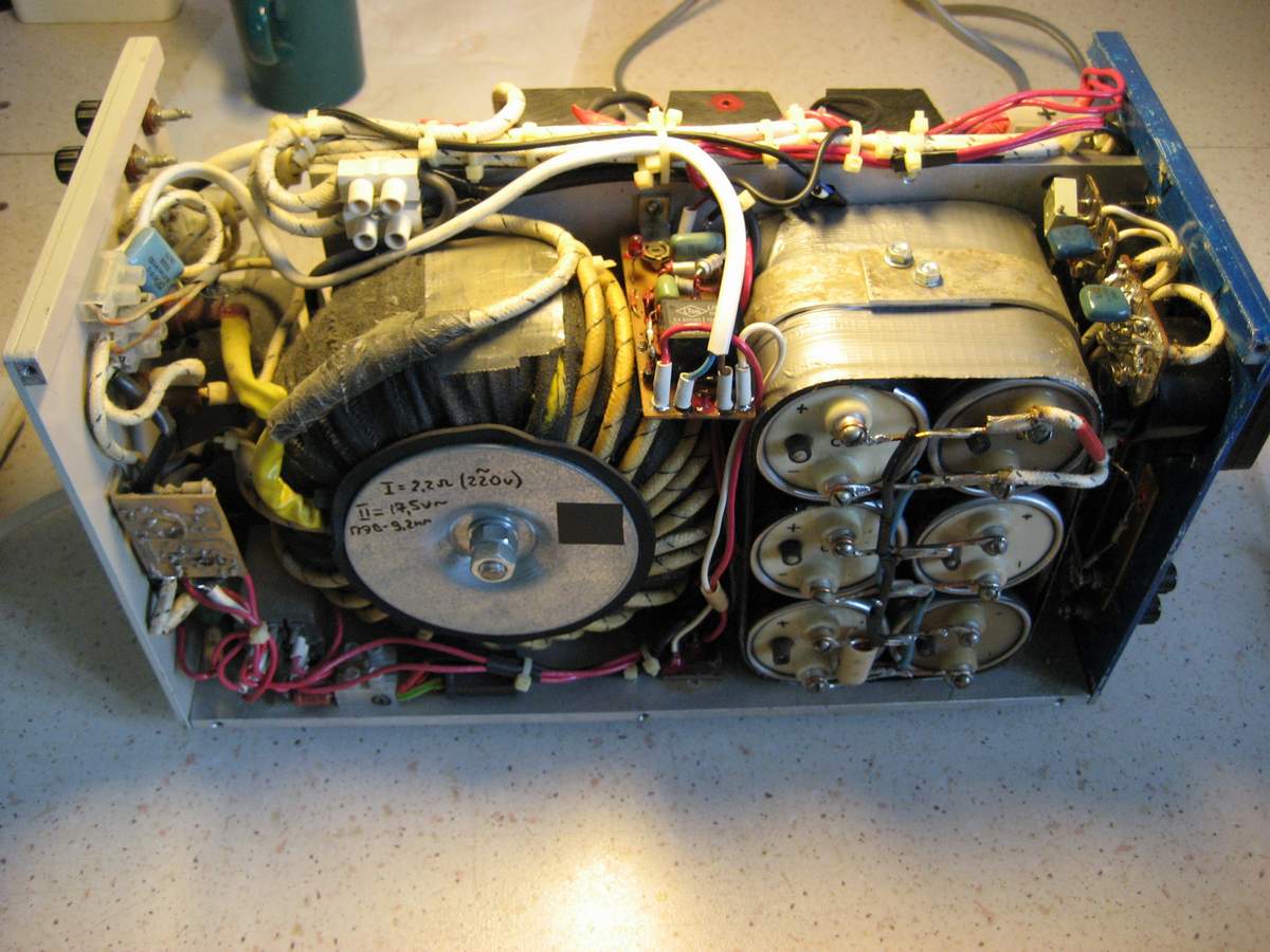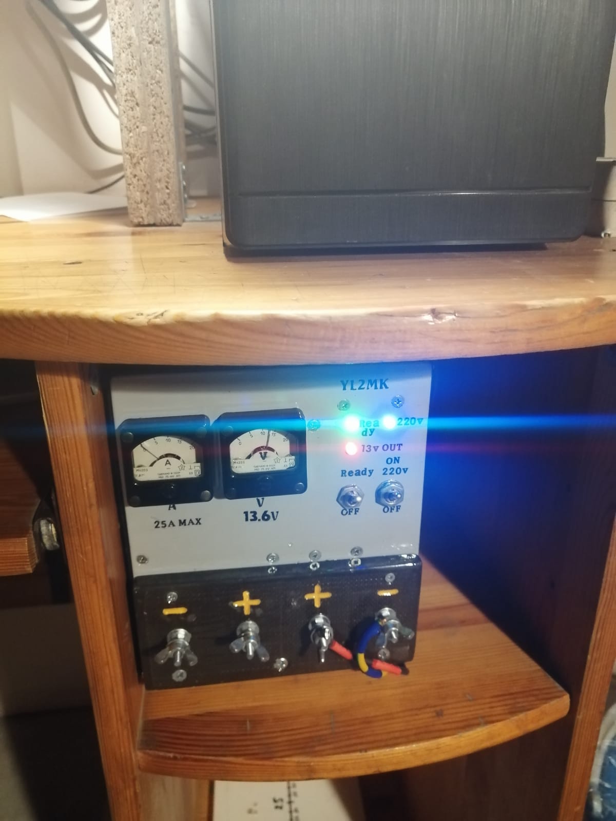 БП был испытан под длительное время нагрузкой в 25А и показал отличную стабильность выходного напряжения. Таким образом было решено его облагородить и разместить в корпусе со стрелочными приборами тока и напряжения. Установить дополнительыне фильтра по входу (со стороны сети) и по выходу, что бы гарантированно исключить влияние импульсной техники на приемопередающую технику.