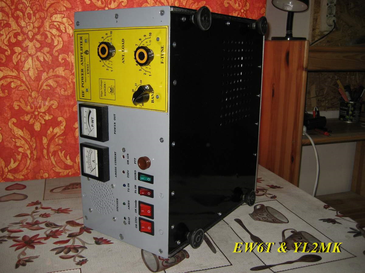 Сам усилитель собран по классической схеме с общей сеткой (ОС) и с классическим блоком питания, с раскачкой в катод. Настроен на 6 радиолюбительских диапазонов, 80м-40м-30м-20м-15м-10м. Имеет входные диапазонные полосовые фильтры. Управление РТТ - "педаль" или внешний контакт реле, управление РТТ подачей внешнего +12в на ключевой транзистор УСМ, кнопка на передней панели, для ручного управления и контроля РТТ.