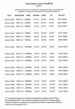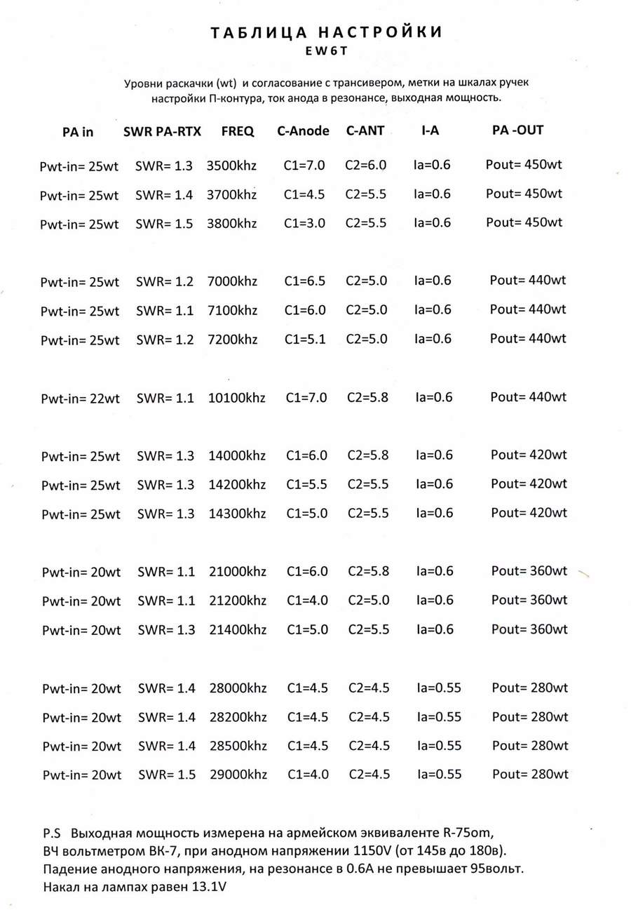 Усилитель прошел тщательную настройку. Настройки, отображены в приведенной ниже, таблице, по диапазонам. В режиме "несущей", практически отработал 40 минут, на армейском эквиваленте не выключаясь. Нагрев анодного транформатора едва едва ощутим. Хорошая линейность сигнала, обеспечивается до тока анода в 0.6А, выше уровень раскачки, поднимать нежелательно, хотя мощность еще приростает. На эквиваленте легко отдает мощность в 400вт.
